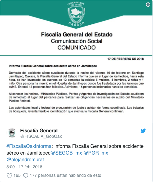 En el comunicado emitido en Twitter a través de la de la cuenta oficial de la Fiscalía, se dijo que derivado del accidente que tuvo lugar la noche del viernes en Santiago Jamiltepec, se recogieron los cuerpos de cinco mujeres, cuatro hombres, dos niñas y un niño; una persona más falleció en el Hospital del Jamiltepec, donde había sido trasladada por las lesiones. Otras 15 personas con heridas han sido atendidas.